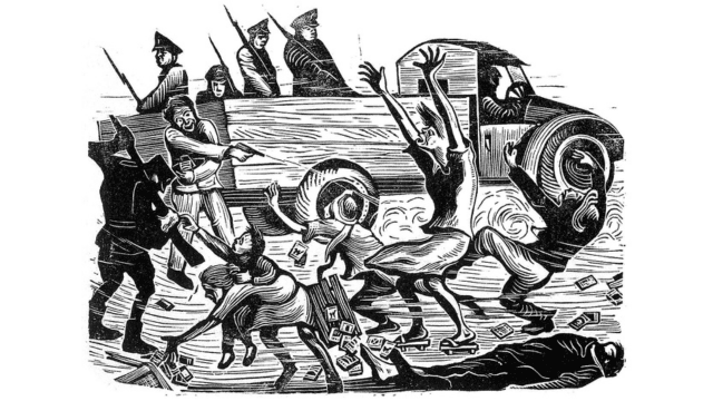 “The Horrifying Inspection,” a famous print by artist Huang Ron-Can (1920–1952), became an iconic image of the 228 incident and the White Terror. Credits.